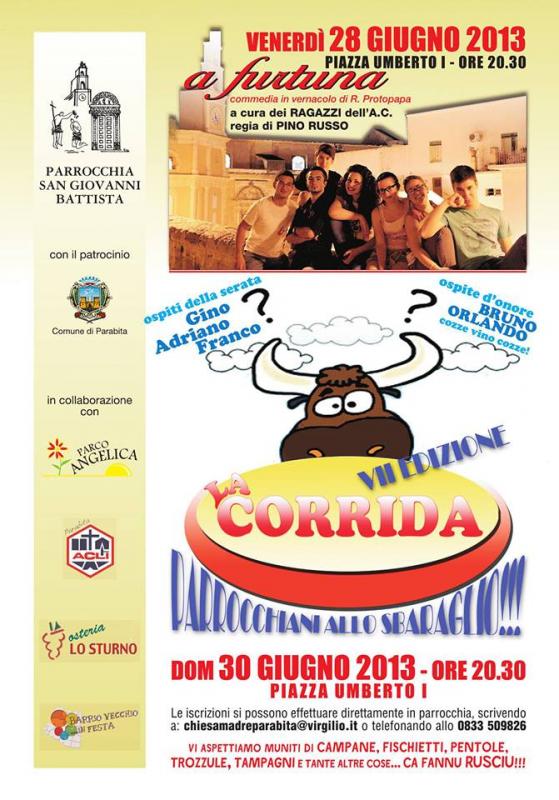 VENERDI' 28 GIUGNO 2013 - ore 20.30 "a furtuna" - commedia in vernacolo a cura dei ragazzi dell'A.C. DOMENICA 30 giugno 2013 - ore 20.30 VII Edizione de "La CORRIDA - Parrocchiani allo sbaraglio" - le iscrizioni si possono effettuare direttamente in Parrocchia, scrivendo a chiesamadreparabita@virgilio.it o telefonando allo 0833.509826