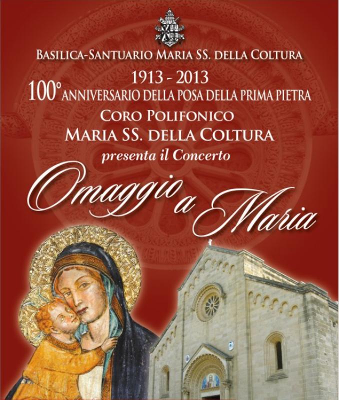Il Coro Polifonico Maria Ss. della Coltura presenta il concerto "Omaggio a Maria" il 5 maggio 2013 in occasione dei festeggiamenti per il centenario della costruzione del santuario!
