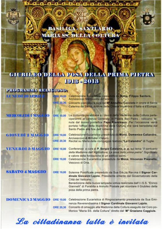 L'intero programma ufficiale dei Festeggiamenti in onore di Maria SS. della Coltura 25-26-27 maggio 2013