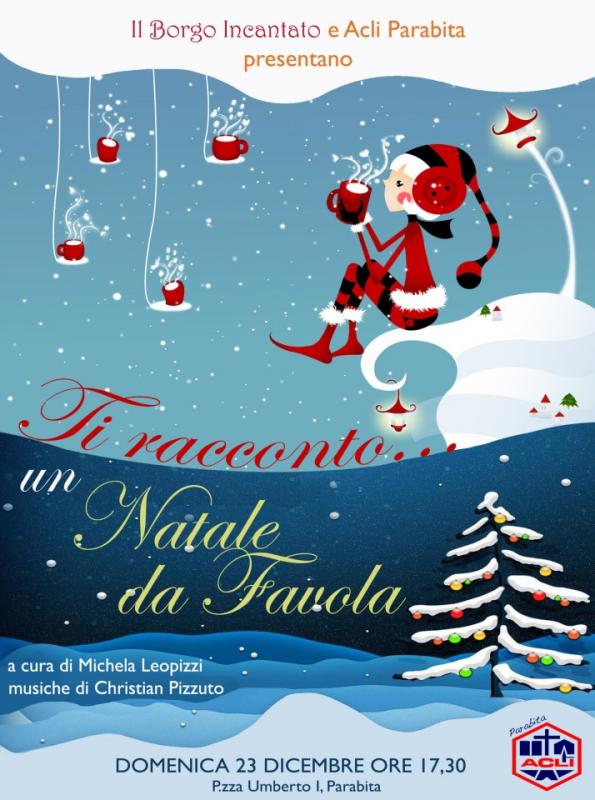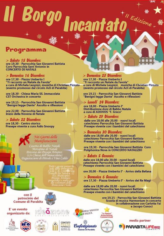 DOMENICA 23 DICEMBRE Piazza Umberto I° dalle 10,00 alle 12,00 e dalle 17,00 alle 20,00 Mercatino di Natale Piazza Umberto I° ore 17,30 "Ti racconto un Natale da Favola" a cura di Michela Leopizzi, musiche di Christian Pizzuto (evento promosso dal circolo Acli di Parabita) Parrocchia San Giovanni Battista ore 19,15 "Benigni legge Dante" Ascolto e riflessioni