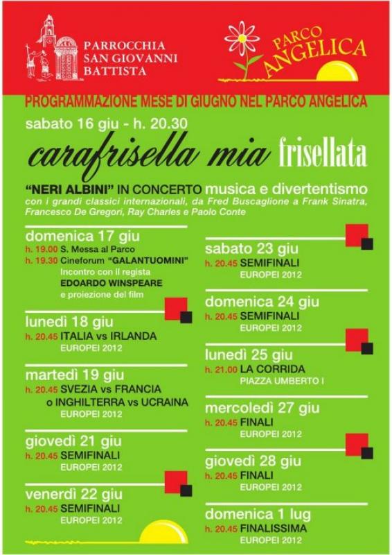 Ore 19,30 Parrocchia San Giovanni Battista S. Messa Solenne presieduta da Don Lucio Borgia e animata dal Coro della Parrocchia di S. Anna - Parabita Ore 20,00 - Piazzetta degli Uffici - Presentazione del libro "Spritte te core" di Luigi Vigna per l'APA Ore 20,30 - Piazza della Vittoria (centro storico) - Musica con la partecipazione dei gruppi: Nel terreno di Romano rifiorisce la legalità. Inaugurato Parco Angelica „Poprocks and coke (M. Marilù Greco)“ , Jackpot (Parrocchia S. Antonio), The creed (Movimento giovanile domenicano) Supersonic. Ore 24,00 Spettacolo di arte Pirotecnico Si esibiranno le Ditte: > Dario Luigi di Matino (LE) > Pirotecnica Morsani di Rieti
