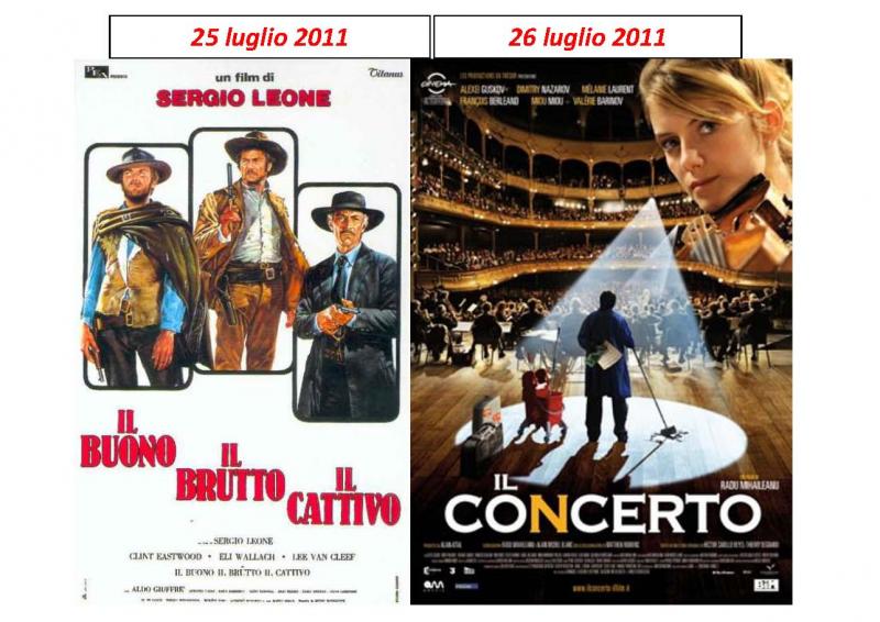 25-26-27-29 luglio la parrocchia organizza quattro serate di cinema all'aperto. Lunedi 25: IL BUONO IL BRUTTO IL CATTIVO, Martedi 26: IL GLADIATORE, Mercoledi 27: IL CONCERTO, Venerdi 29: NUOVO CINEMA PARADISO. ingresso libero. vi aspettiamo!
