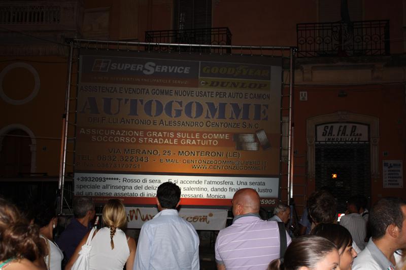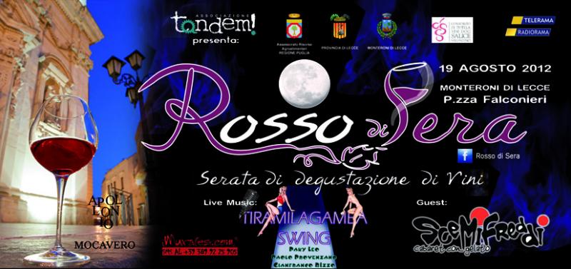 Si è conclusa meravigliosamente la V Edizione di Rosso di Sera in Piazza Falconieri a Monteroni di Lecce. La manifestazione ha dato lustro alle pregiate cantine vinicole del Salento che hanno permesso ai visitatori di degustare i loro vini migliori. Ad accompagnare i calici i prodotti tipi salentini e la novità 2012: l'angolo sushi! Ad allietare il percorso enogastronomico gli apprezzatissimi "Scemifreddi" e il gruppo musicale di “Gianfranco Rizzo & Tiramilagamba Swing”.