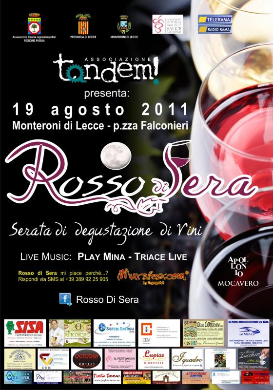 Con il patrocinio dell’Assessorato alle Risorse Agroalimentari della Regione Puglia, in collaborazione con la Provincia di Lecce e il Comune di Monteroni di Lecce, l’Associazione TANDEM! presenta “Rosso di sera V edizione”, evento che si svolgerà domenica 19 agosto nella splendida cornice di Piazza Falconieri del comune di Monteroni di Lecce, con inizio previsto per le ore 21. Ad allietare la serata, sarà proposto uno spettacolo di musica live del gruppo “Gianfranco Rizzo & Tiramilagamba Swing” ed il cabaret dei “Scemifreddi”. Anche quest'anno iMurales permetterà di commentare l'evento via sms allo 389.9225905 o gratuitamente attraverso il sito www.imurales.com...buona degustazione a tutti!