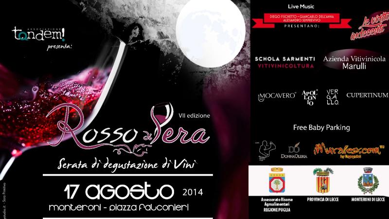 VII Edizione di Rosso di Sera, 17 Agosto alle ore 21.00 in Piazza Falconieri a Monteroni di Lecce! Vi aspettiamo numerosi per gustare insieme dei vini veramente speciali all'insegna dell'allegria e del divertimento anche quest'anno sostenuti dai nostri speciali sponsor che ringraziamo sin da ora.. Non mancate!!!