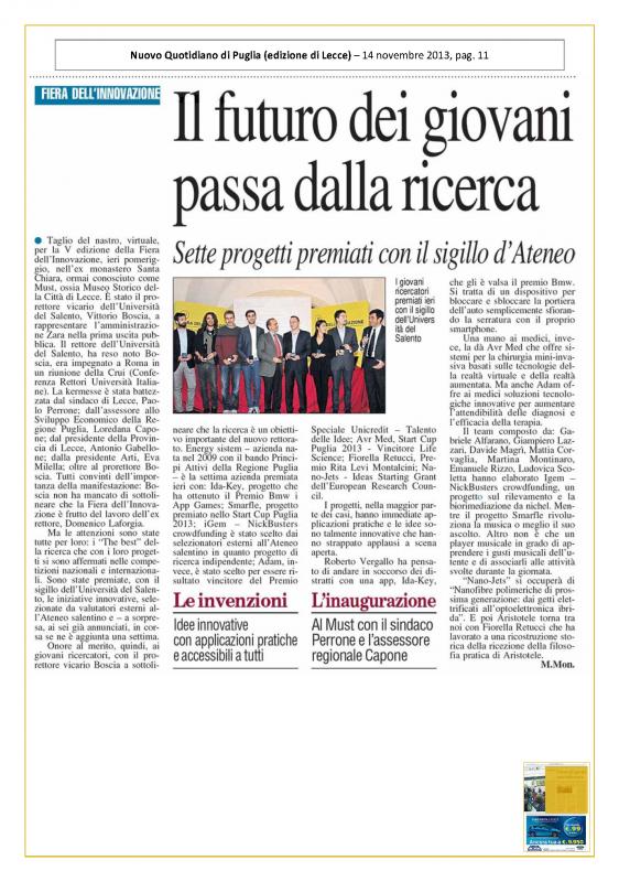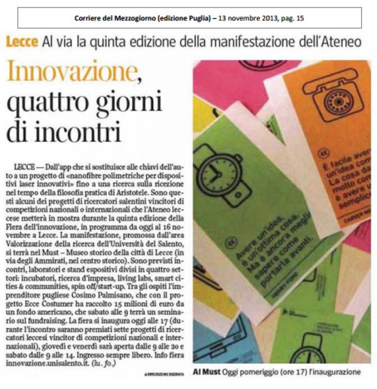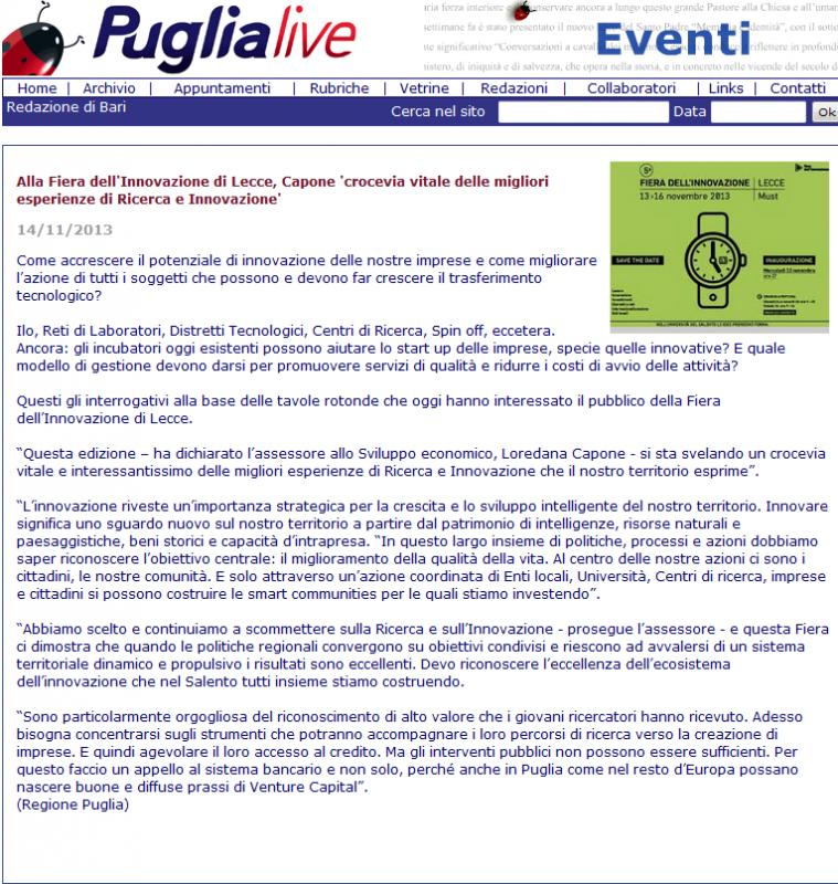 Articoli su: - Nuovo Quotidiano di Puglia (edizione di Lecce) - Corriere del Mezzogiorno (edizione Puglia) - La Gazzetta del Mezzogiorno (edizione di Lecce) - La Repubblica (edizione di Bari)