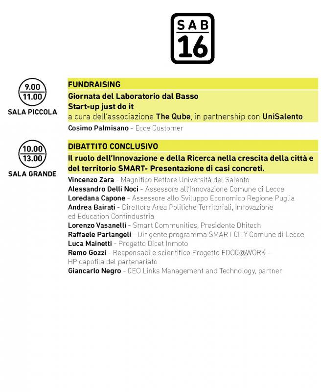 ORE 10:00 – 13.00 - Dibattito Conclusivo Il ruolo dell’Innovazione e della Ricerca nella crescita della città e del territorio SMART. Presentazione di casi concreti. Modera Adelmo Gaetani – Ordine dei Giornalisti della Puglia. Vincenzo Zara – Magnifico Rettore Università del Salento; Alessandro Delli Noci – Assessore all’ Innovazione Comune di Lecce; Loredana Capone – Assessore allo Sviluppo Economico Regione Puglia; Andrea Bairati – Direttore Area Politiche Territoriali, Innovazione ed Education Confindustria; Lorenzo Vasanelli – Presidente Dhitech – Smart Communities; Raffaele Parlangeli – Dirigente programma SMART CITY Comune di Lecce; Luca Mainetti – Progetto Dicet Inmoto; Remo Gozzi – responsabile scientifico Progetto EDOC@WORK – HP capofila del partenariato; Giancarlo Negro – CEO Links Management and Technology