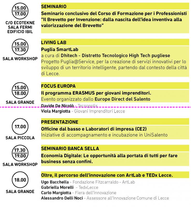 ORE 18.00 - Sala Grande Convegno Oltre, il percorso dell’innovazione con ArtLab e TEDx Lecce > Ugo Bacchella – Fondazione Fitzcarraldo – ArtLab > Gabriella Morelli – TedxLecce > Carlo Margiotta – Fiera dell’Innovazione > Alessandro Delli Noci – Assessore all’ Innovazione Comune di Lecce