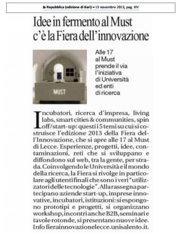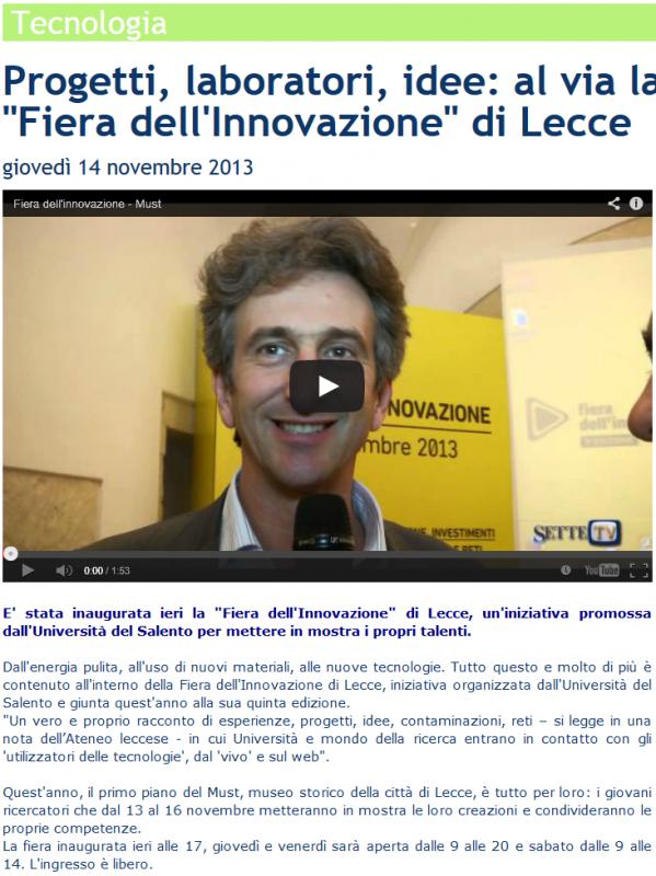 Partiti!!! Il benvenuto ai presenti da parte del Prorettore dell'Universita' del Salento, il Sindaco di Lecce, l'Assessore allo sviluppo economico Regione Puglia, il Presidente Arti e il Presidente della Provincia di Lecce in una sala gremita di gente... La Fiera dell'Innovazione vi aspetta fino a sabato 16 novembre con tutte le novità in materia di innovazione, presso il Must di Lecce - INGRESSO GRATUITO Il video http://youtu.be/kZN82W84_D8