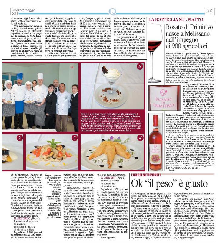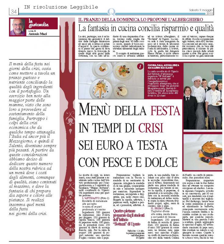 Quotidiano di Puglia del 09 maggio 2015 "Menù della Festa in tempo di Crisi. Sei euro a testa con pesce e dolce. Il pranzo della domenica lo propone l'Alberghiero di Ugento"
