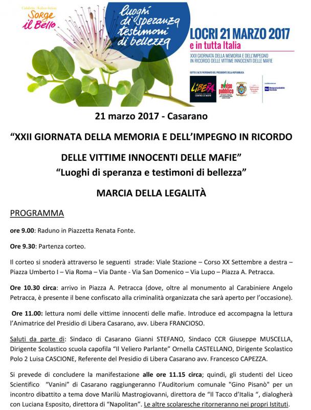 21 MARZO 2017 MARCIA DELLA LEGALITA' XXII GIORNATA DELLA MEMORIA E DELL'IMPEGNO IN RICORDO DELLE VITTIME INNOCENTI DELLE MAFIE"