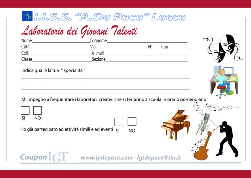 Hai un "talento" che vorresti coltivare attraverso la nostra scuola? Compila il coupon che trovi su http://www.ipdepace.com o su http://www.imurales.com e invialo a lgtdepace@tin.it verrai contattato per partecipare ai nostri Laboratori Creativi. La frequenza è gratuita!