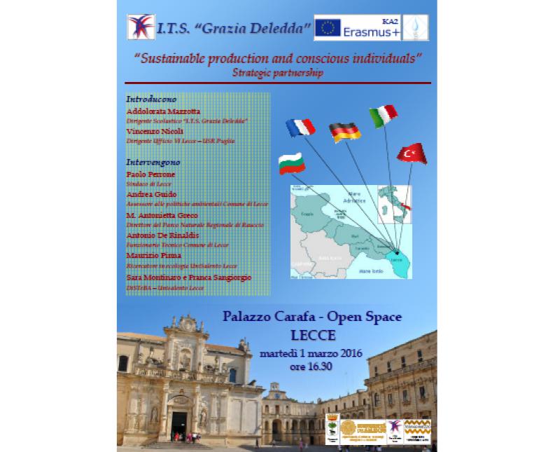 Si comunica a tutto il personale della scuola che martedì 1 marzo alle ore 16.30 presso l’Open Space di Palazzo Carafa, si terrà l’evento di apertura del Progetto Erasmus plus KA2 “Sustainable production and conscious individuals”. La comunità scolastica è invitata a partecipare. Il Dirigente Scolastico Addolorata Mazzotta