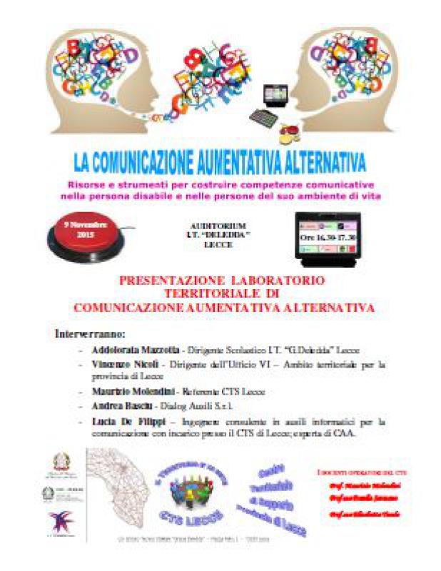 Presentazione laboratorio territoriale di Comunicazione Aumentativa Alternativa Lunedì 9 novembre 2015 ore 16.30-17.30 Interverranno: Addolorata Mazzotta Dirigente Scolastico I.T. “G.Deledda” Lecce Vincenzo Nicolì Dirigente dell’Ufficio VI – Ambito territoriale per la provincia di Lecce Maurizio Molendini Referente CTS Lecce Andrea Basciu Dialog Ausili S.r.l. Lucia De Filippi Ingegnere consulente in ausili informatici per la comunicazione con incarico presso il CTS di Lecce - Esperta di CAA