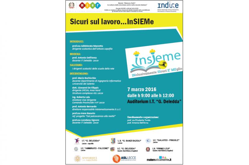 Progetto InSiEMe Bando MIUR Memory Safe Giornata di informazione e sensibilizzazione sui seguenti temi: • La sicurezza sui luoghi di lavoro • le nuove tecnologie applicate alla didattica Introduce: • prof.ssa Addolorata Mazzotta (D.S. IT Deledda) Modera: • prof. Antonio Dell'Anna (IT Deledda) Intervengono: • prof. Mario Bochiccio (Università del Salento) • dott. Giovanni De Filippis (Dirigente SPESAL) • ing. Roberta Lala (Comando prov.le VVF Lecce) • prof. Antonio Bernardo (Matematicamente.it) • prof.ssa Irene Basurto (Liceo Banzi) • prof.ssa Loredana Signore (IT Deledda) Lunedì 7 marzo 2016 ore 9.00-12.00 Auditorium I.T. "G. Deledda" Lecce Coordinamento e organizzazione: • proff. Elisabetta Tundo - Antonio Dell'Anna