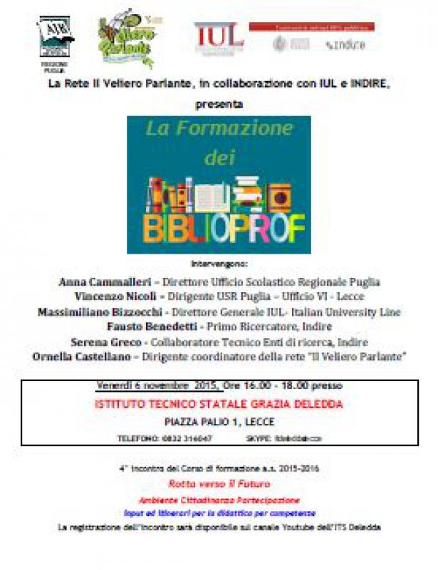 Venerdì 6 novembre 2015 ore 16.00-18.00 c/o I.T. "Grazia Deledda" Piazza Palio 1 - Lecce Intervengono Anna Cammalleri – Direttore Ufficio Scolastico Regionale Puglia Vincenzo Nicolì – Dirigente USR Puglia – Ufficio VI - Lecce Massimiliano Bizzocchi - Direttore Generale IUL- Italian University Line Fausto Benedetti - Primo Ricercatore, Indire Serena Greco - Collaboratore Tecnico Enti di ricerca, Indire Ornella Castellano – Dirigente coordinatore della rete “Il Veliero Parlante”