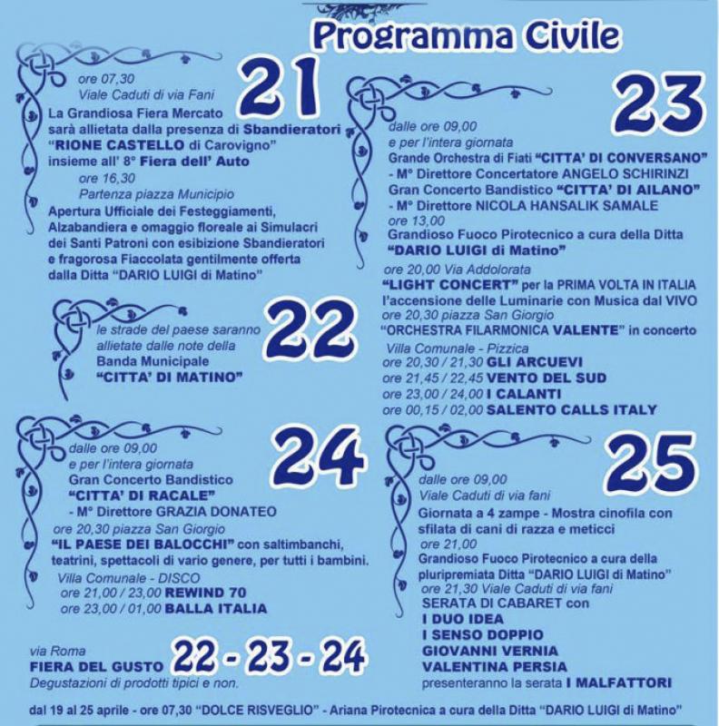 Ore 20.00 Via Addolorata "LIGHT CONCERT" per la prima volta in Italia l'accensione delle Luminarie con Musica dal VIVO Ore 20.30 Piazza S. Giorgio "ORCHESTRA FILARMONICA VALENTE" in concerto A partire dalle ore 20.30 Villa Comunale - Pizzica: - GLI ARCUEVI - VENTO DEL SUD - I CALANTI - SALENTO CALLS ITALY