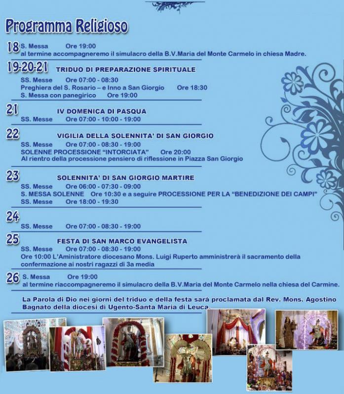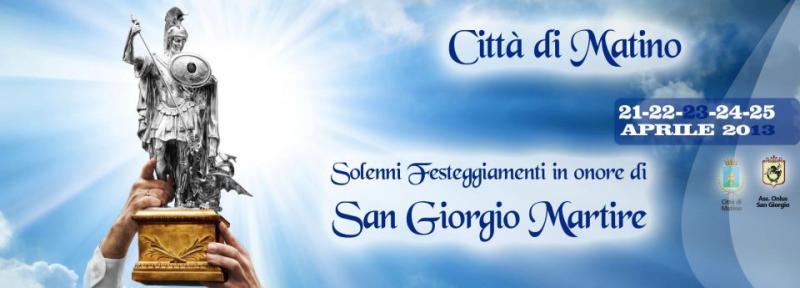 Mancano ormai pochi giorni all'apertura ufficiale dei Festeggiamenti in onore di S. Giorgio Martire a Matino. Quest'anno i giorni di Festa saranno dal 21 al 25 aprile con tante tante novità. I Matinesi in Paese ma soprattutto i Matinesi nel Mondo possono tenersi aggiornati attraverso il nostro canale iMurales e sul nuovo sito Matinesi.it Ogni momento della Festa sarà opportunamente documentato tramite foto e video. Inoltre quest'anno la redazione iMurales da la possibilità a chiunque di mandare i propri scatti che verranno pubblicati sui siti web e sulla bacheca digitale iMurales nella Festa insieme ai vostri sms. Seguiteci quindi... vi terremo aggiornati! Lo Staff iMurales