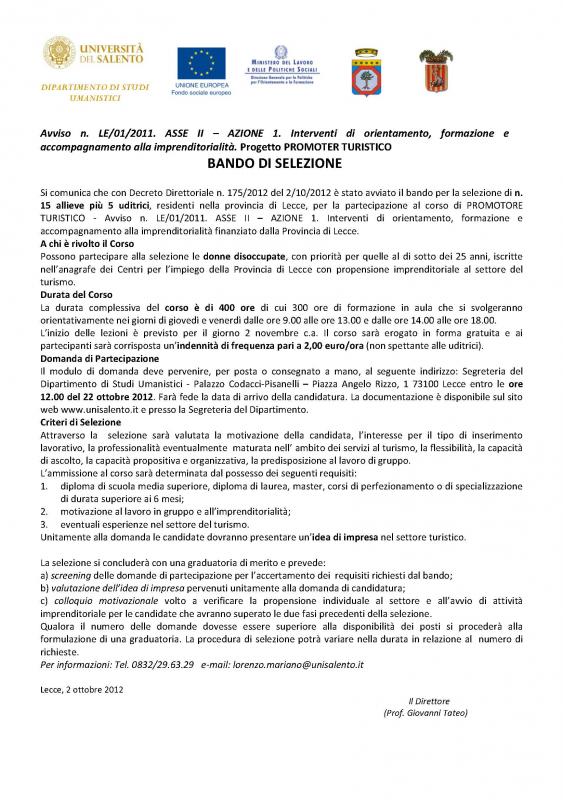 Si comunica che con Decreto Direttoriale n. 175/2012 del 2/10/2012 è stato avviato il bando per la selezione di n. 15 allieve più 5 uditrici, residenti nella provincia di Lecce, per la partecipazione al corso di PROMOTORE TURISTICO - Avviso n. LE/01/2011. ASSE II – AZIONE 1. Interventi di orientamento, formazione e accompagnamento alla imprenditorialità finanziato dalla Provincia di Lecce. Il modulo di domanda deve pervenire, per posta o consegnato a mano, al seguente indirizzo: Segreteria del Dipartimento di Studi Umanistici - Palazzo Codacci-Pisanelli – Piazza Angelo Rizzo, 1 73100 Lecce entro le ore 12.00 del 22 ottobre 2012. Farà fede la data di arrivo della candidatura. La documentazione è disponibile sul sito web www.unisalento.it e presso la Segreteria del Dipartimento.