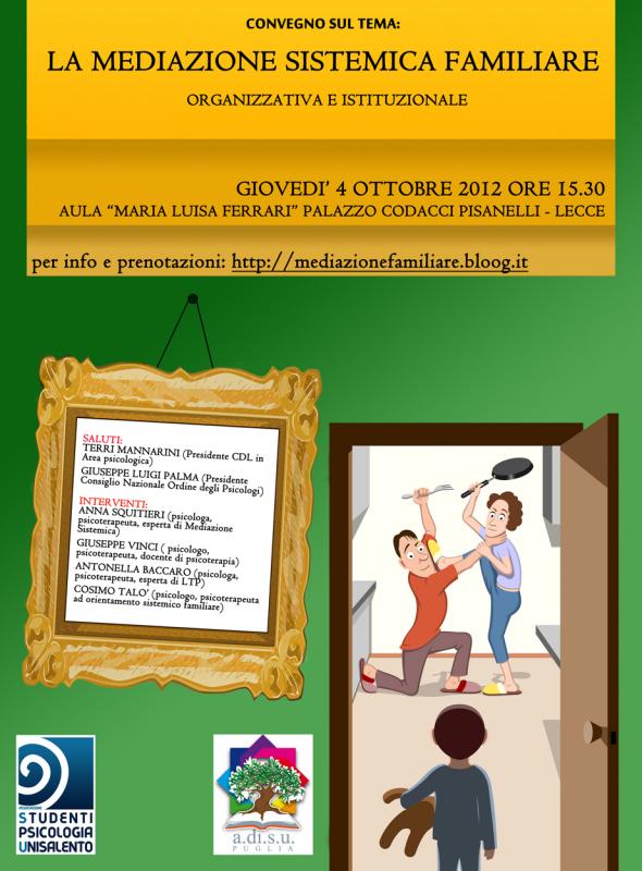 Convegno "La Mediazione Sistemica Familiare, Organizzativa ed Istituzionale" - Il giorno 4 ottobre 2012 alle ore 15.30 presso l'aula "Maria Luisa Ferrari" di Palazzo Codacci Pisanelli (Ateneo) si terrà il Convegno "La Mediazione Sistemica Familiare, Organizzativa ed Istituzionale" organizzato dall'Associazione Universitaria STUDENTI PSICOLOGIA UNISALENTO e finanziato da A.Di.Su Puglia nell'ambito della realizzazione di iniziative a carattere formativo, culturale e sociale promosse dagli studenti degli Atenei e delle Istituzioni Afam pugliesi. Il Convegno è aperto a tutti gli studenti dell'Università del Salento che vogliano parteciparvi e darà diritto al rilascio di un attestato di partecipazione. Per tutte le informazioni e per prenotarsi http://mediazionefamiliare.bloog.it