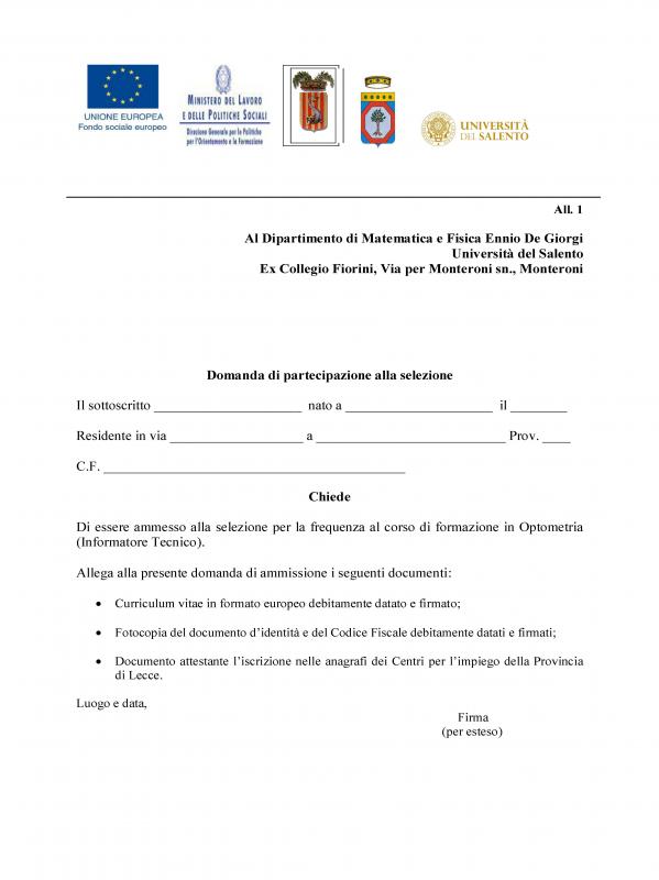 Presso la sede accreditata del Dipartimento di Fisica, oggi Dipartimento di Matematica e Fisica “Ennio De Giorgi” dell’Università del Salento è attivata per l’anno accademico 2012/2013 la prima edizione del Corso di Formazione in “Optometria (Informatore Tecnico)”. Scadenza 9 ottobre 2012, ore 13.00 Per ulteriori informazioni: http://www.matfis.unisalento.it/news/-/news/viewDettaglio/29032238/6040214