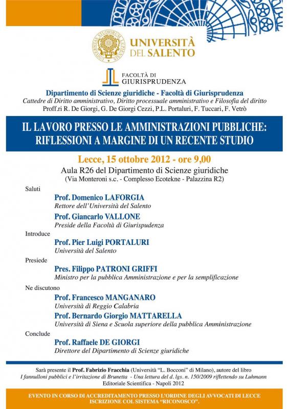 Si svolgerà, nella Facoltà di Giurisprudenza, lunedì 15 ottobre a partire dalle ore 9.00, l’incontro di studio sulla “riforma Brunetta”, presieduto dal Ministro Filippo Patroni Griffi e introdotto dal Prof. Pier Luigi Portaluri. Dopo i saluti del Magnifico Rettore, Prof. Domenico Laforgia, e del Preside della Facoltà, Prof. Giancarlo Vallone, interverranno i Professori Manganaro e Mattarella. Concluderà i lavori il Direttore del Dipartimento Prof. Raffaele De Giorgi. Sarà presente il Prof. Fracchia autore di una recentissima monografia sulla “riforma Brunetta” riletta alla luce delle teorie di Luhmann.