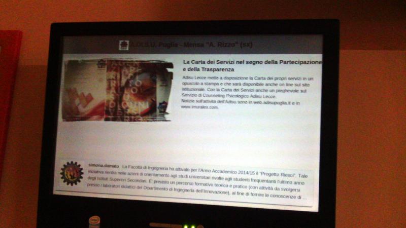 E’ stato istituito un servizio di promozione delle prestazioni ADISU dedicate agli studenti che si iscrivono all’Università del Salento, all’Accademia di Belle Arti ed al Conservatorio “Tito Schipa” di Lecce, cui hanno aderito alcuni istituti di istruzione superiore delle province di Lecce e Brindisi. Il primo incontro si è svolto ieri presso l’IISS E. Giannelli di Parabita e Alezio dove la dottoressa Isabella Spalluto e la signora Angela De Giovanni hanno illustrato con l’aiuto di supporti multimediali e distribuendo materiale informativo pubblicitario cartaceo, la realtà dei servizi messi a disposizione degli studenti dall'Agenzia per il Diritto allo Studio Universitario di Lecce.