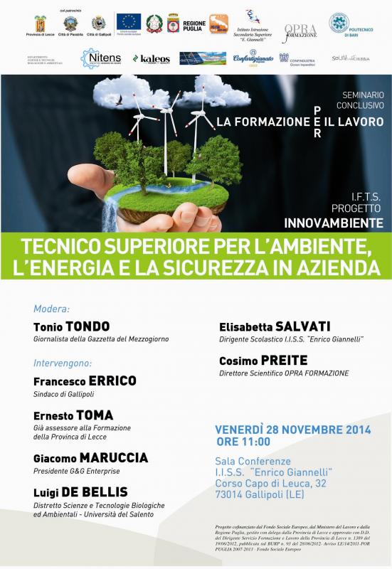 Venerdì 28 novembre alle 11:00 presso l’I.I.S.S. “GIannelli” a Gallipoli in Corso Capo di Leuca, 32 si terrà la cerimonia conclusiva del progetto di formazione I.F.T.S. “Istruzione Formazione Tecnica Superiore” denominato Innovambiente con il tema “LA FORMAZIONE PER IL LAVORO”