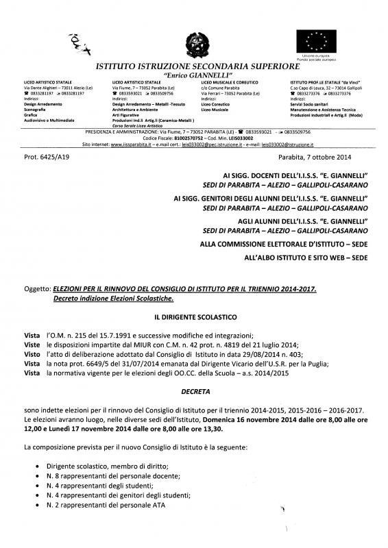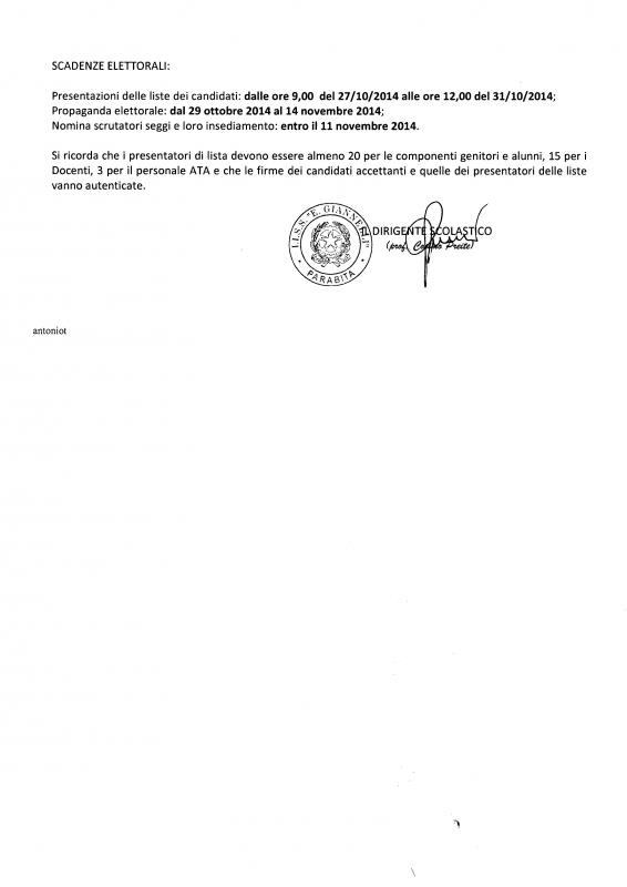 Sono indette elezioni per il rinnovo del Consiglio di lstituto per il triennio 2014 -2015, 20I5-2016, 2016-2017. Le elezioni avranno luogo, nelle diverse sedi dell'lstituto, Domenica 16 novembre 2014 dalle ore 8.00 alle ore 12.00 e Lunedì 17 novembre 2014 dalle ore 8.00 alle ore 13.30! SCADENZE ELETTORALI: Presentazioni delle liste dei candidati: dalle ore 9,00 del 27 ottobre 2014 alle ore 12.00 del 31/10/2014; Propaganda elettorale: dal 29 ottobre 2014 al 14 novembre 2014; Nomina scrutatori seggi e loro insediamento: entro il 11 novembre 2014
