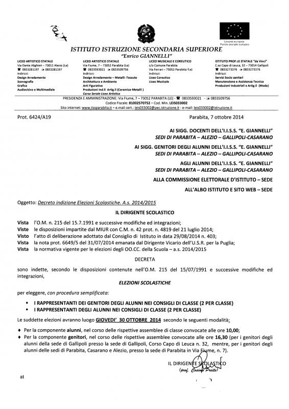 Per eleggere, con procedura semplificata: - I RAPPRESENTANTI DEI GENITORI DEGLI ALUNNI NEI CONSIGLI DI CLASSE (2 PER CLASSE) - I RAPPRESENTANTI DEGLI ALUNNI NEI CONSIGLI DI CLASSE (2 PER CLASSE) Le suddette elezioni avranno luogo GIOVEDI' 30 OTTOBRE 2014 secondo le seguenti modalità: - Per la componente alunni, nel corso delle rispettive assemblee di classe convocate alle ore 10.00 - Per la componente genitori, nel corso delle rispettive assemblee convocate alle ore 16.30 ( per i genitori degli alunni della sede di Gallipoli presso la sede di Gallipoli, mentre per i genitori degli alunni delle sedi di Parabita, Alezio, Casarano presso la sede di Parabita.