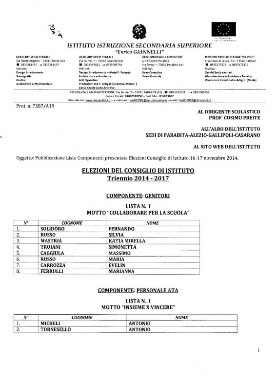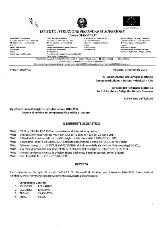 Pubblicato sul sito scolastico il decreto di proclamazione degli Eletti del Consiglio d'Istituto per il triennio 2014-2017