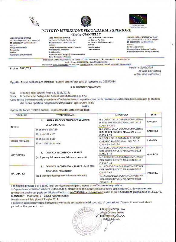 E' stato pubblicato sul sito scolastico www.iissparabita.it il bando inerente la selezione di docenti per i corsi di recupero dell'a.s. 2013/2014. Le domande di ammissione devono essere redatte in carta libera con allegato CV e consegnate anche per mezzo PEC entro le ore 12.00 del 24 giugno all'I.I.S.S. E. Giannelli - via Fiume, 7 - Parabita - leis033002@pec.istruzione.it