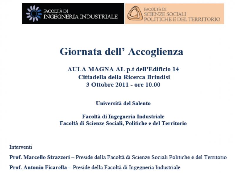 SI AVVISANO GLI STUDENTI CHE IL GIORNO 3 OTTOBRE 2011 SI TERRA' L'ANNUALE GIORNATA DELL'ACCOGLIENZA NELL'AULA MAGNA AL AL P.T. DELL'EDIFICIO 14 ORE 10.00 - CITTADELLA DELLA RICERCA