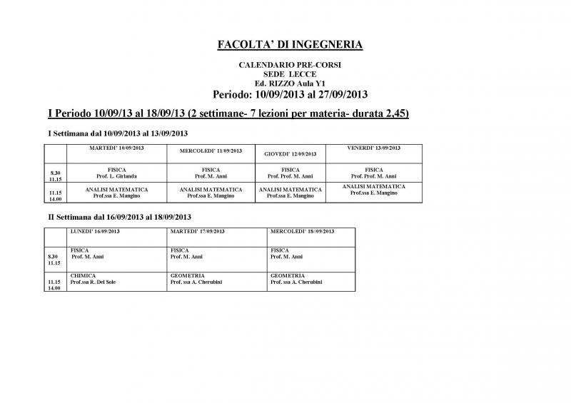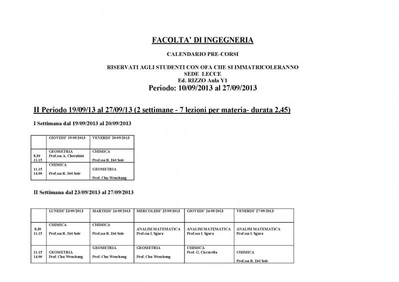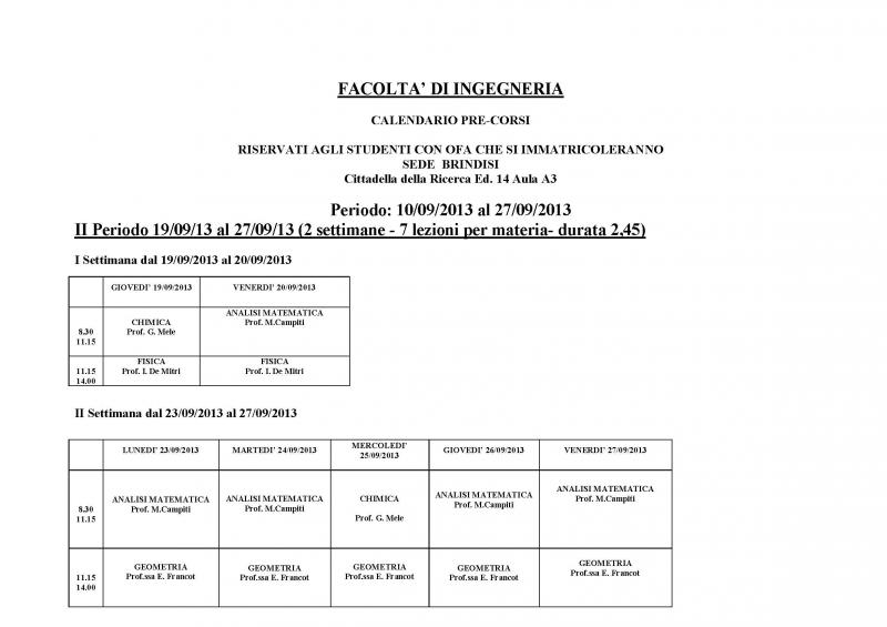 Pubblicati sul sito di facoltà http://www.ingegneria.unisalento.it i calendari dei pre-corsi la cui frequenza è vivamente consigliata agli studenti che all'esito del TEST di accesso CISIA sono stati attribuiti O.F.A- (Obblighi formativi aggiuntivi). Si segnala che i pre-corsi saranno svolti sul Polo didattico di Lecce e sul Polo Didattico di Brindisi per permettere agli studenti di iscriversi in relazione alla sede didattica di iscrizione prescelta.