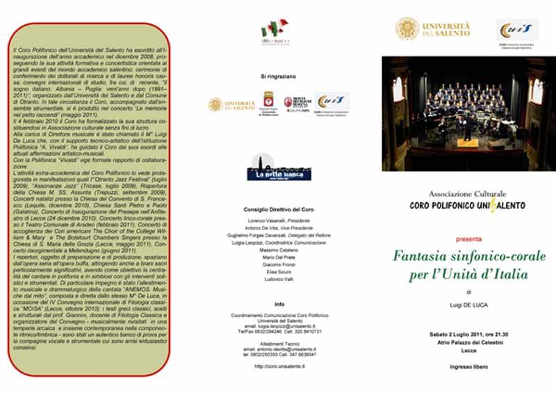 "Fantasia sinfonico-corale per l'Unità d'Italia" Lecce - Palazzo Celestini - 2 luglio 2011 - h. 21,30 - ingresso libero. L'evento musicale si inserisce ne "La Notte bianca" e nel Concerto per il 150° dell'Unità, fortemente voluto dal CUIS. Dirige L. De Luca. Maggiori info: http://coro.unisalento.it