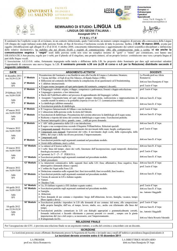 Il seminario ha l’esplicito scopo di avvicinare, in un contesto istituzionale, quale l’Università, un numero sempre maggiore di persone alla conoscenza della Lingua LIS (lingua dei segni italiana) usata dalle persone Sorde, al fine di favorisce l’inclusione sociale di tutte le persone. Inoltre, il D.M. 18 marzo 2005, avente per oggetto «Modificazioni agli allegati B e D al D.M. 4 ottobre 2000, concernente rideterminazione e aggiornamento dei settori scientifico-disciplinari e definizione delle relative declaratorie», ha stabilito che nei diversi livelli e registri di comunicazione, oltre alla comunicazione orale e scritta, ci sia anche la comunicazione segnica. I “segni” usati dalle persone sorde non sono un semplice insieme di “gesti” o “mimi” per comunicare, essi hanno una grammatica ben precisa, regole per i verbi, per il plurale ed il singolare, una propria sintassi, ed un proprio lessico: costituiscono una vera e propria lingua al pari delle lingue vocali. L’Associazione A.E.E.O.S. onlus, fortemente impegnata nella tutela e diffusione della LIS, ha proposto detto Seminario per dare agli universitari salentini l’opportunità di conoscere una nuova lingua: la LIS. Il seminario prevede n.30 ore (n.25 di corso e n.5 per la Relazione) distribuite secondo il programma disponibile sul sito di Facoltà: www.lingue.unisalento.it. Le prenotazioni entro il 15.12.2011 a:presidenza.lingue@unisalento.it
