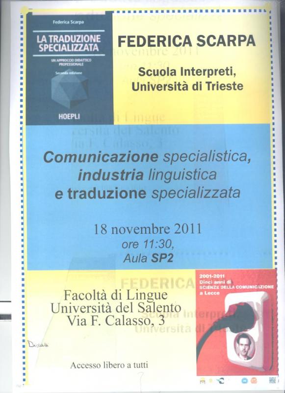 Il giorno 18 novembre 2011 alle ore 11.30 nell'Aula SP/2 dell'Edificio Sperimentale Tabacchi la Dr.ssa Federica Scarpa della Scuola Interpreti dell'Università di Trieste, terrà un Seminario dal titolo " Comunicazione specialistica, Industria linguistica e Traduzione specializzata". La S.V. è invitata a partecipare - L'accesso è libero a tutti