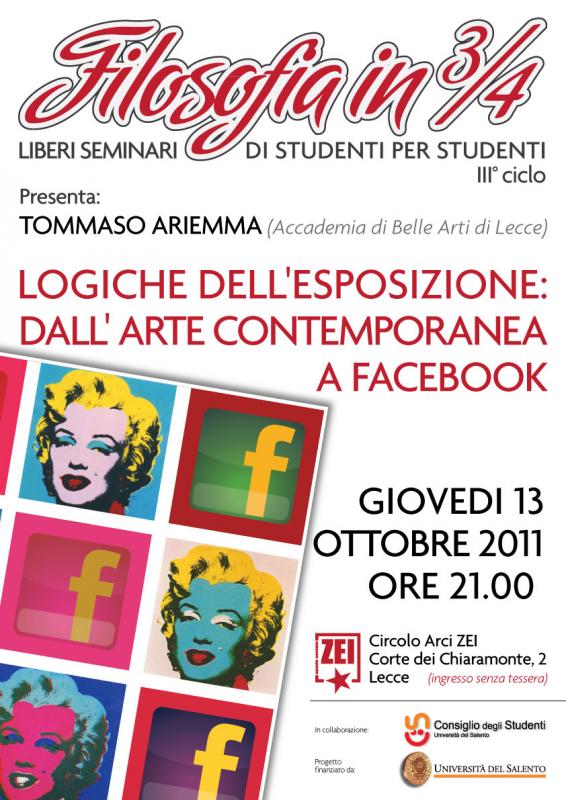 Giovedi 13 ottobre, ore 21.00, presso il Circolo Arci Zei di Lecce "FILOSOFIA IN 3/4" ospita Tommaso Ariemma per un seminario dal titolo "Logiche dell'esposizione: dall'arte contemporanea a Facebook". Il calendario di Filosofia in 3/4 sarà ricco di nuovi incontri che si susseguiranno nei prossimi mesi attraverso l'analisi di argomenti di vario interesse, dalla filosofia all'estetica, dalla fisica alla politica, ospitando anche gli stessi studenti che abbiano voglia di confrontarsi sui propri interessi.