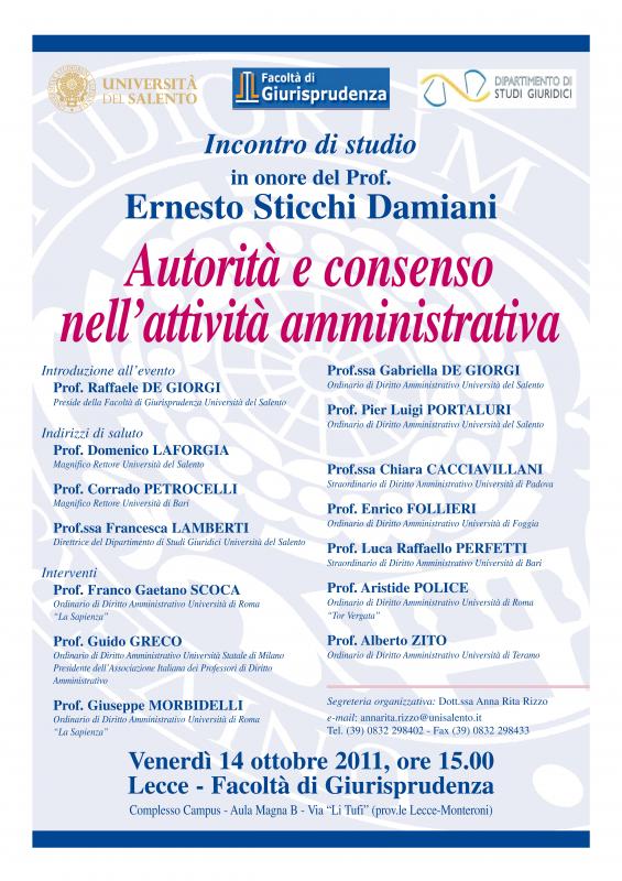 “Autorità e consenso nell’attività amministrativa” Venerdì 14 ottobre 2011, ore 15,00, presso l’Aula Magna B (Complesso Campus, Via “Li Tufi” - prov.le Lecce-Monteroni) si svolgerà una giornata di Studio con la quale la Facoltà di Giurisprudenza intende rendere omaggio alla figura accademica del Prof. Ernesto Sticchi Damiani. L’evento è aperto alla partecipazione di tutti gli studenti.