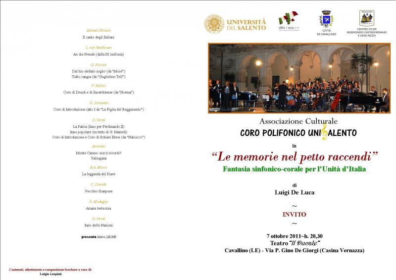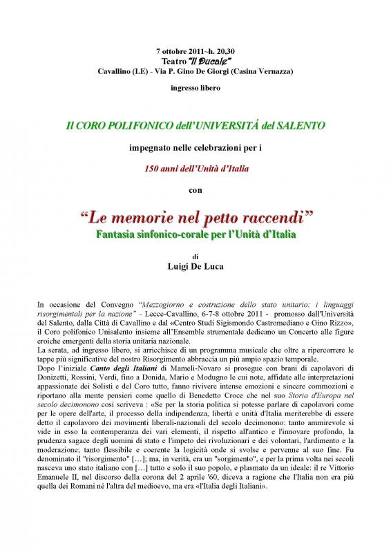 Si svolgerà dal 6 all’8 ottobre 2011 il convegno “Mezzogiorno e costruzione dello Stato unitario. I linguaggi risorgimentali per la Nazione”, promosso dall’Università del Salento, dalla Città di Cavallino e dal «Centro Studi Sigismondo Castromediano e Gino Rizzo», e con il coinvolgimento del Conservatorio di Musica “Tito Schipa” di Lecce. Nella serata del 7 si terrà alle ore 20.30, presso il teatro "Il Ducale" di Cavallino, la fantasia sinfonico-corale "Le memorie nel petto raccendi" del coro polifonico dell'Università del Salento.