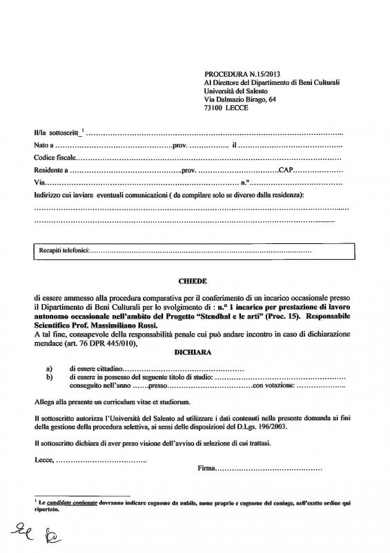 Avviso pubblico di procedura comparativa per l’affidamento di n.° 1 incarico per prestazione di lavoro autonomo occasionale nell’ambito del Progetto “Stendhal e le arti” (Proc. 15). Responsabile Scientifico Prof. Massimiliano Rossi.