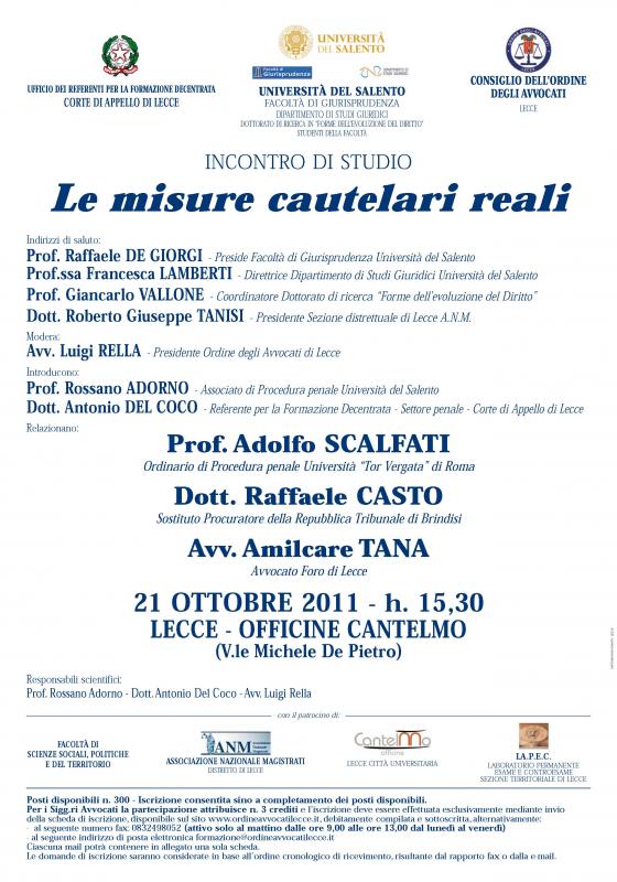 "Le misure cautelari reali" - Relatori: il Prof. Adolfo Scalfati, Ordinario di Procedura penale presso l'Università "Tor Vergata" di Roma, il Dott. Raffaele Casto, Sostituto procuratore della Repubblica presso il Tribunale di Brindisi, e l'Avv. Amilcare Tana, Penalista del Foro di Lecce – Venerdì 21 ottobre 2011, ore 15.30, presso le Officine Cantelmo (Lecce) Referente: Prof. Rossano Adorno
