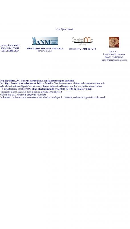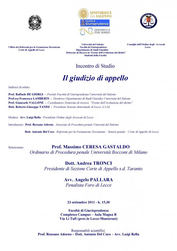 "Il giudizio di appello" – Relatori: Prof. Avv. Massimo Ceresa Gastaldo, Ordinario di Procedura penale presso l'Università “Bocconi” di Milano, Dott. Andrea Tronci, Presidente di Sezione di Corte di Appello s.d. Taranto e l'Avv. Angelo Pallara, Penalista del Foro di Lecce Venerdì 23 settembre 2011 ore 15.30, presso l’Aula Magna B della Facoltà di Giurisprudenza - Via Li Tufi Strada per Monteroni (Referente Prof. Rossano Adorno)
